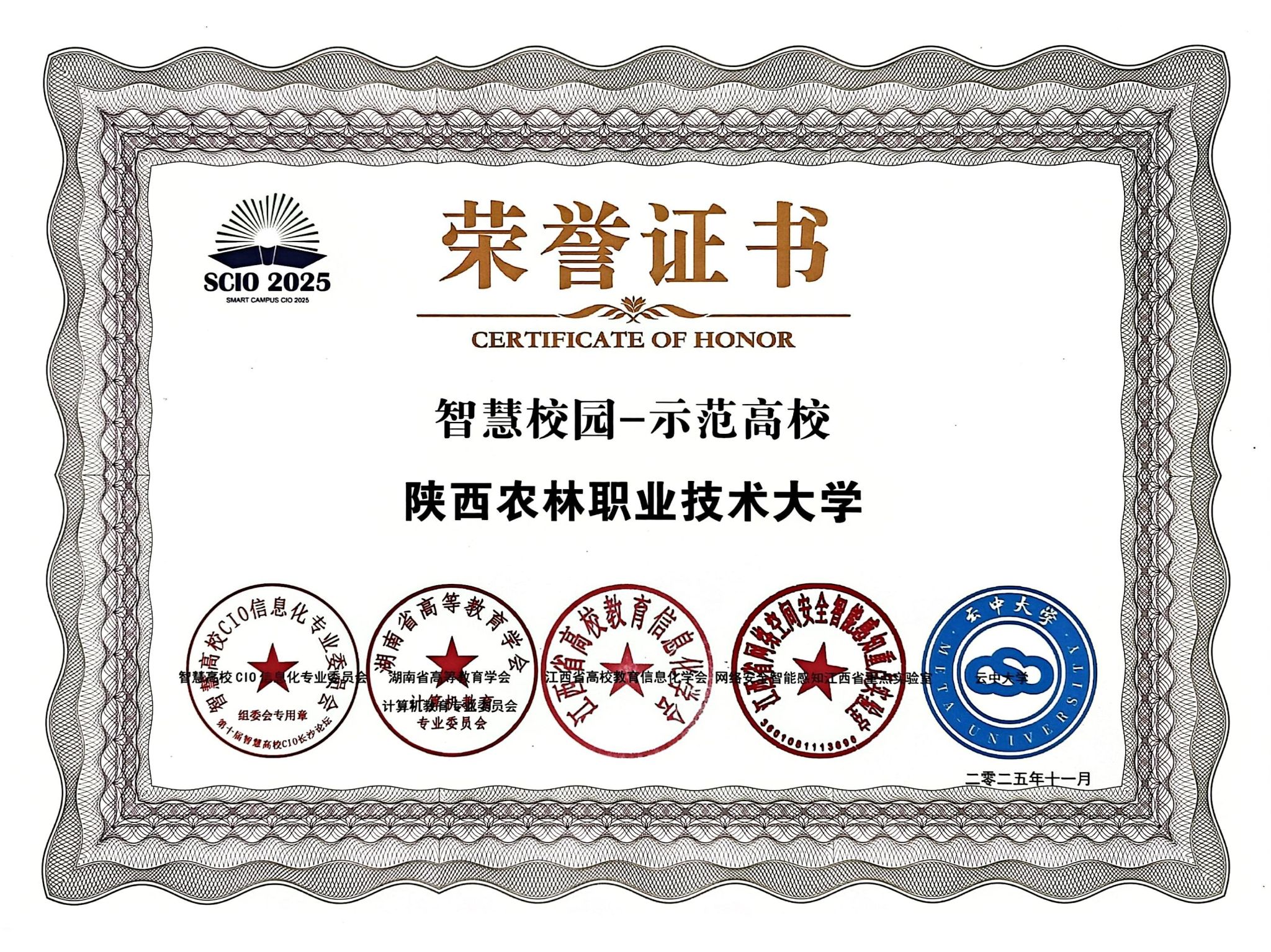 11月20日,第十届智慧高校CIO论坛在湖南长沙举办,我校凭借智慧校园建设的突出成效,斩获“智慧校园-示范高校”集体荣誉,信息化建设与管理处夏浩军、李伟分别获评“智慧高校信息化突出人物”“智慧高校信息化优秀人物”。