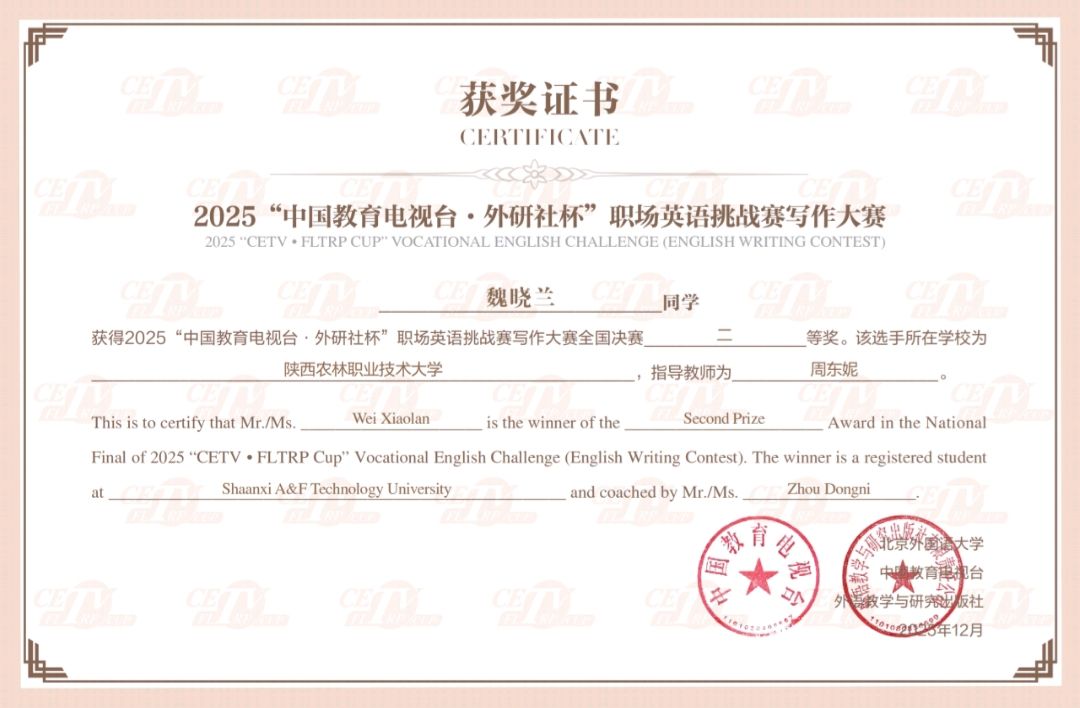 近日,2025“中国教育电视台・外研社杯”职场英语挑战赛写作大赛与演讲大赛全国决赛圆满结束。学校应用英语专业学生杨承玉获演讲赛项全国一等奖,魏晓兰获写作赛项全国二等奖,常璐璐、金思、马海由子、乔雪宁学生团队获英语短视频赛项优秀奖。
