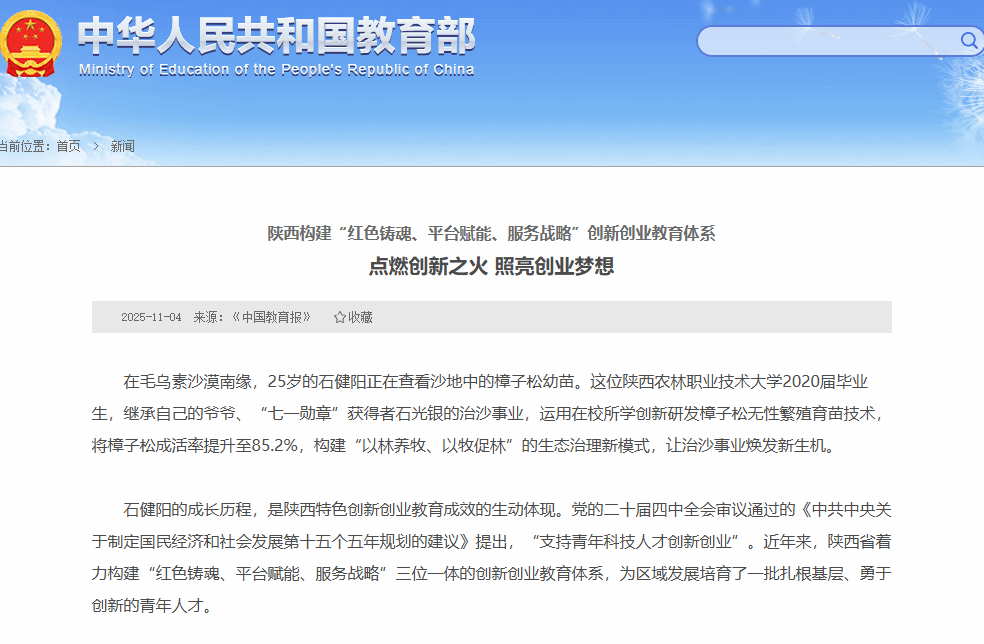 石健阳的成长历程,是陕西特色创新创业教育成效的生动体现。党的二十届四中全会审议通过的《中共中央关于制定国民经济和社会发展第十五个五年规划的建议》提出,“支持青年科技人才创新创业”。近年来,陕西省着力构建“红色铸魂、平台赋能、服务战略”三位一体的创新创业教育体系,为区域发展培育了一批扎根基层、勇于创新的青年人才。