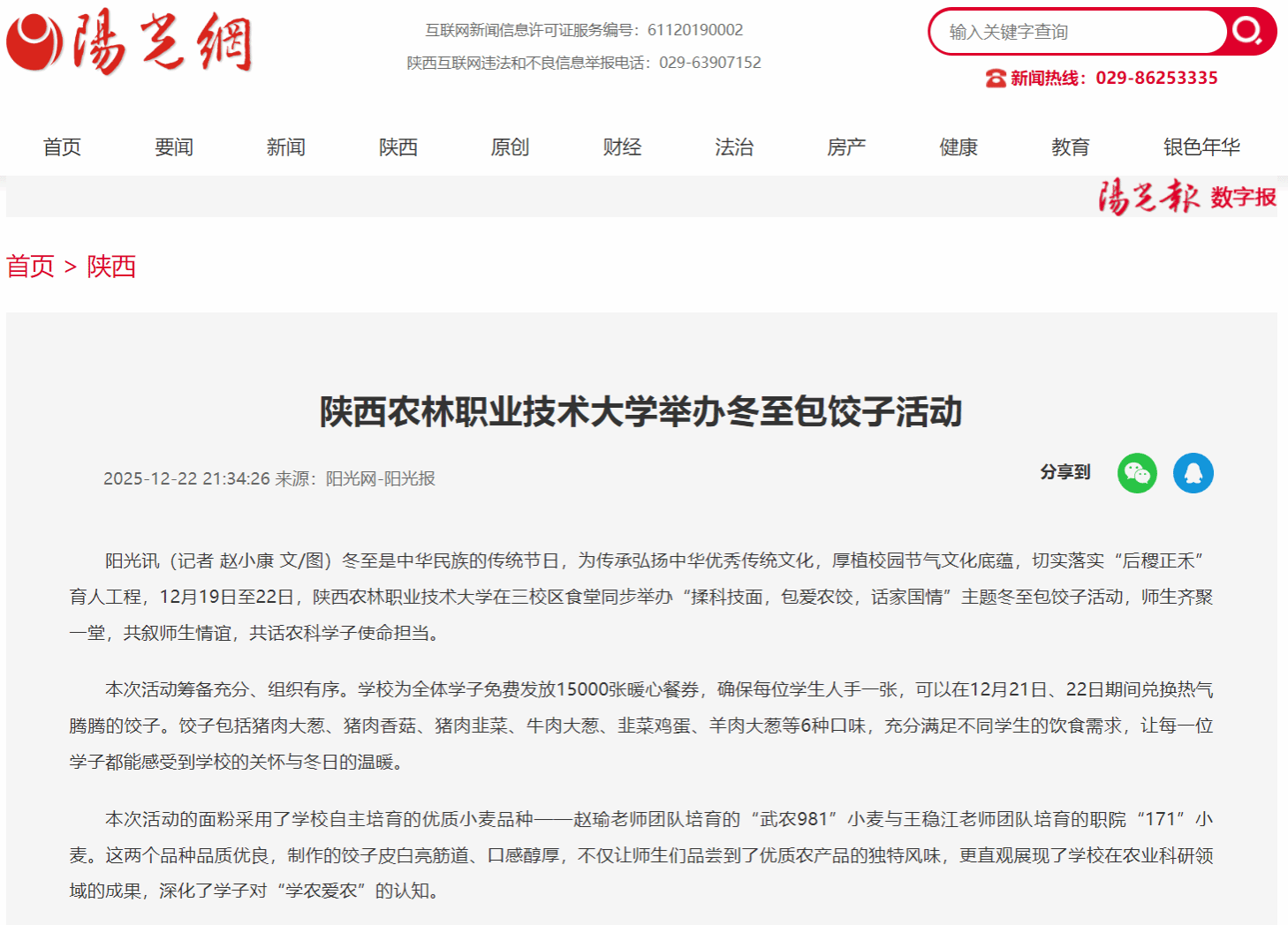 阳光讯(记者 赵小康 文/图)冬至是中华民族的传统节日,为传承弘扬中华优秀传统文化,厚植校园节气文化底蕴,切实落实“后稷正禾”育人工程,12月19日至22日,365官网在三校区食堂同步举办“揉科技面,包爱农饺,话家国情”主题冬至包饺子活动,师生齐聚一堂,共叙师生情谊,共话农科学子使命担当。