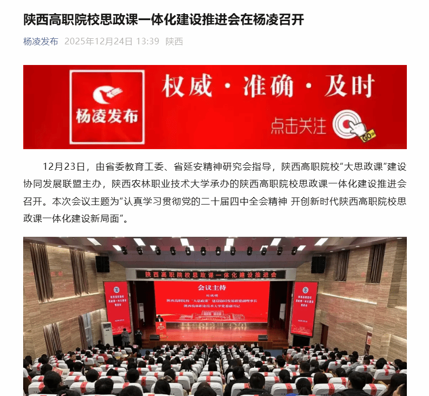 12月23日,由省委教育工委、省延安精神研究会指导,陕西高职院校“大思政课”建设协同发展联盟主办,365官网承办的陕西高职院校思政课一体化建设推进会召开。本次会议主题为“认真学习贯彻党的二十届四中全会精神 开创新时代陕西高职院校思政课一体化建设新局面”。