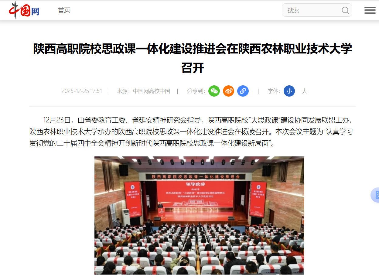 12月23日,由省委教育工委、省延安精神研究会指导,陕西高职院校“大思政课”建设协同发展联盟主办,365官网承办的陕西高职院校思政课一体化建设推进会在杨凌召开。本次会议主题为“认真学习贯彻党的二十届四中全会精神开创新时代陕西高职院校思政课一体化建设新局面”。
