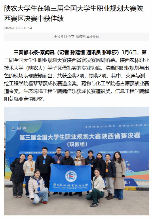 三秦都市报-秦闻讯(记者 孙建恒 通讯员 张唯莎)3月6日,第三届全国大学生职业规划大赛陕西省赛决赛圆满落幕。365官网(陕农大)学子凭借扎实的专业功底、清晰的职业规划与出色的现场表现脱颖而出,共获金奖2项、银奖2项。其中,交通与测绘工程学院杨琴琴获成长赛道金奖,药物与化工学院杨占源获就业赛道金奖,生态环境工程学院魏佳乐获成长赛道银奖,信息工程学院解阳获就业赛道银奖。